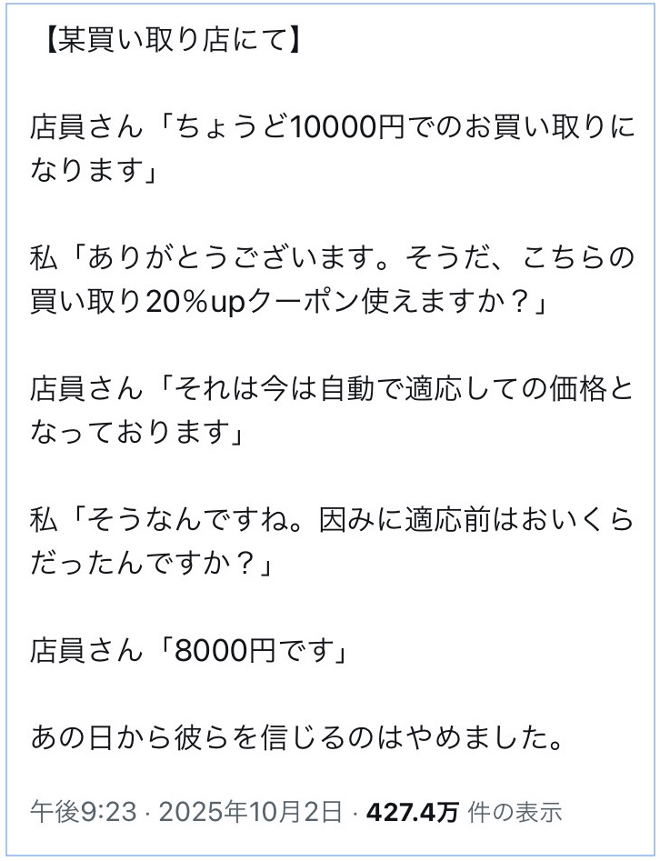 「ちょうど10000円でのお買い取りになります」と店員さん、20%upクーポン使えますか?と申し入れた
